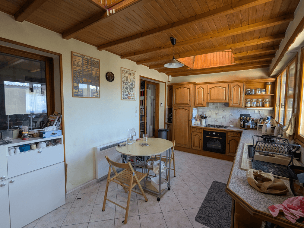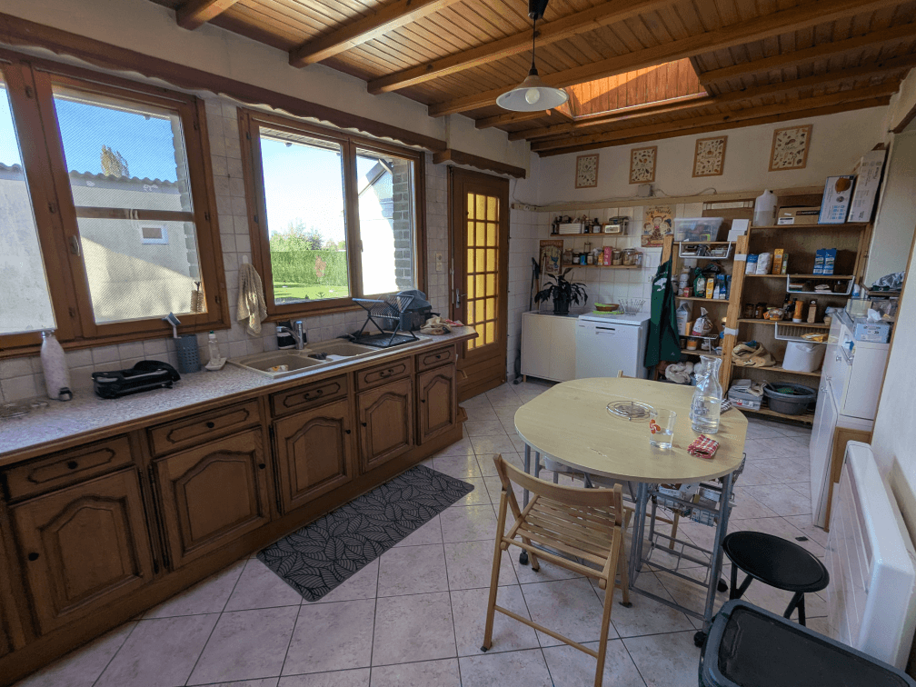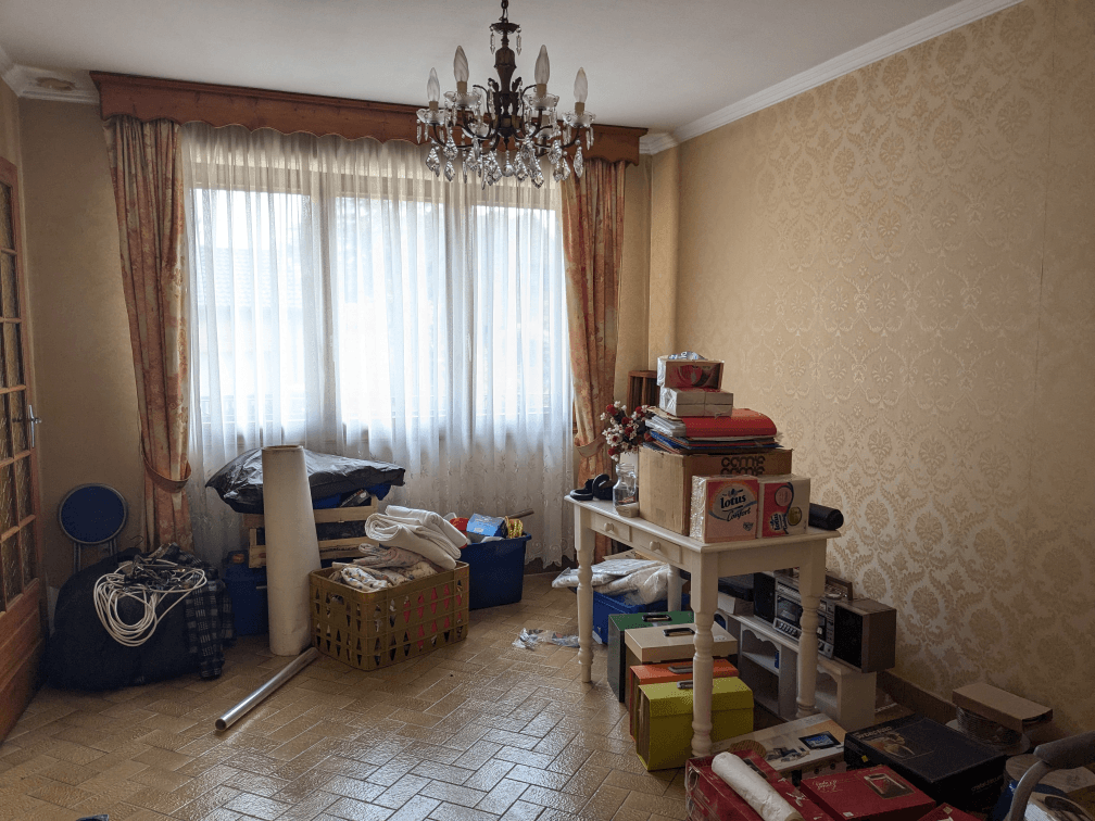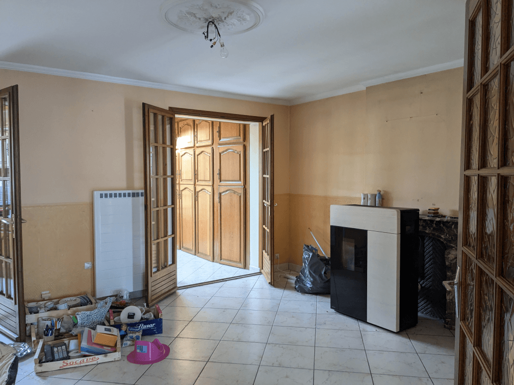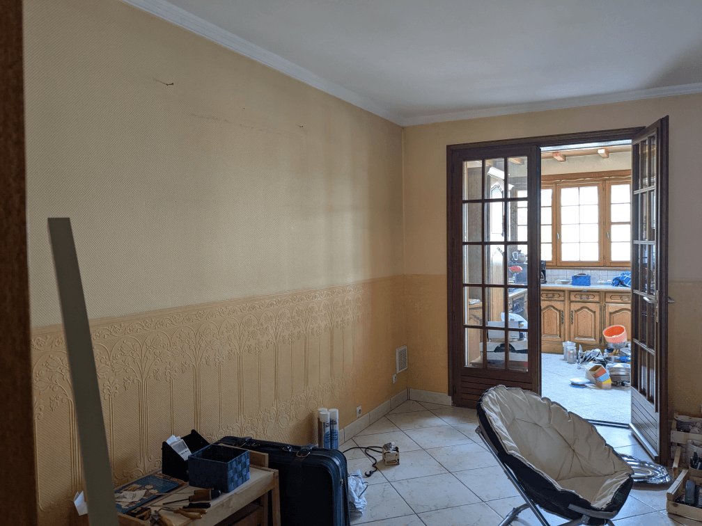 J’avais dit que le lustre ne resterait pas… Pour le moment, il est toujours là, on n’arrive pas à trouver quelque chose qui nous convienne à tous les deux. Peut-être que je customiserai le lustre à l’avenir, à voir ! Dans le salon, il reste encore un meuble à créer pour ranger l’aspirateur à cendres et un sac de pellet d’avance. Les plafonds auront un coup de propre, il reste quelques petites finitions et le gros chantier (le prochain, normalement), c’est les fenêtres, qui seront remises en état par moi-même.