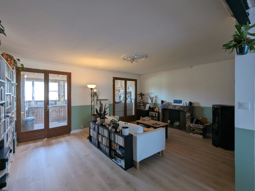 Le salon et le séjour. Alors là, c’est l’un des deux plus gros changements… Les artisans ont fait sauter un mur pour nous, et ils ont aussi réalisé l’isolation sur tous les murs. Nous on a tout peint en vert d’eau et blanc et on a également posé le sol. Je suis super contente du rendu, c’est lumineux et coloré à la fois. Vous apercevez les portes noires qui ont eu leur lifting, celles qui donnent sur la cuisine vont avoir droit au même traitement prochainement. J’ai fait faire des voilages qui sont trop chouettes, laissent passer la lumière mais nous protègent des regards extérieurs, puis nous avons fait poser un poêle à granulés au mois de février dernier.