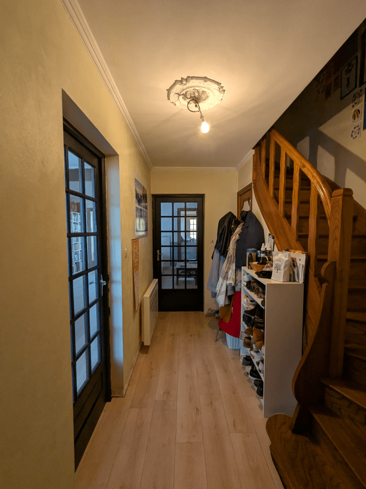 On commence donc par l’entrée. Ici on n’a pas fait beaucoup de changement, à part les portes qui donnent vers le salon, qui étaient donc en bois avec des carreaux jaunes (so 80’s !). On a aussi revu le sol, qui est le même que dans le salon. Il manque encore pas mal de choses à faire par ici : trouver (ou créer) un meuble qui convienne mieux pour l’entrée, refaire les peintures et ajouter les plinthes.