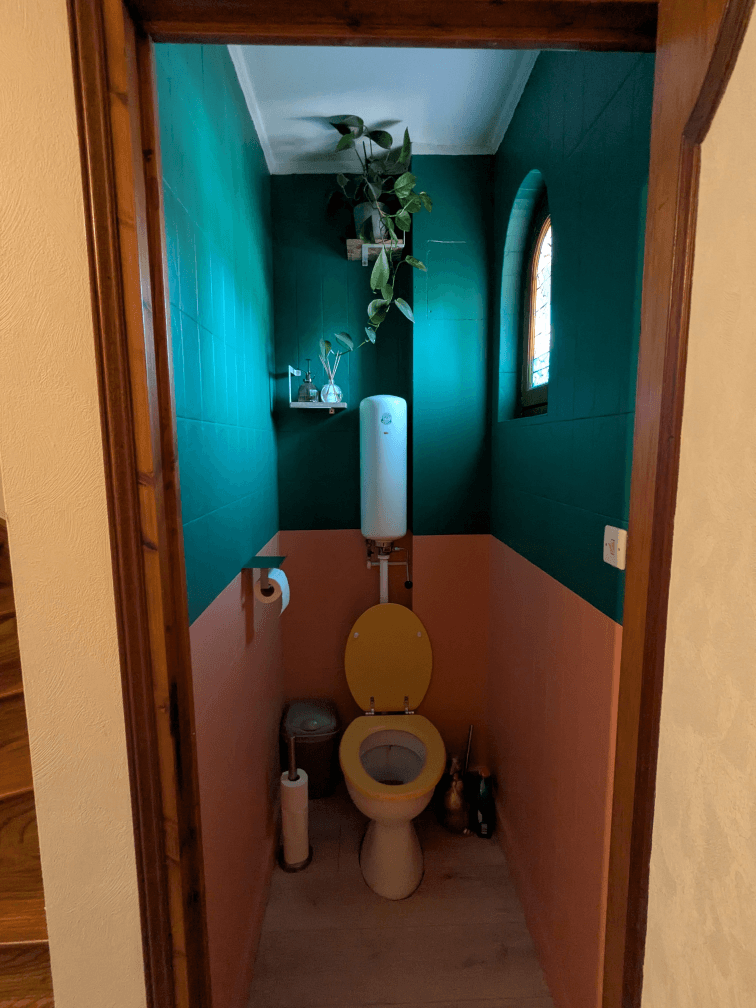 Là aussi on est sur de l’avant/après qui change vraiment. La salle de bain a été réalisée par des artisans, sauf la peinture, c’est moi qui aie sorti les pinceaux ! Quant aux WC, ils sont d’époque et on a choisi de les conserver en l’état, en les relookant, inspiration Wes Anderson…