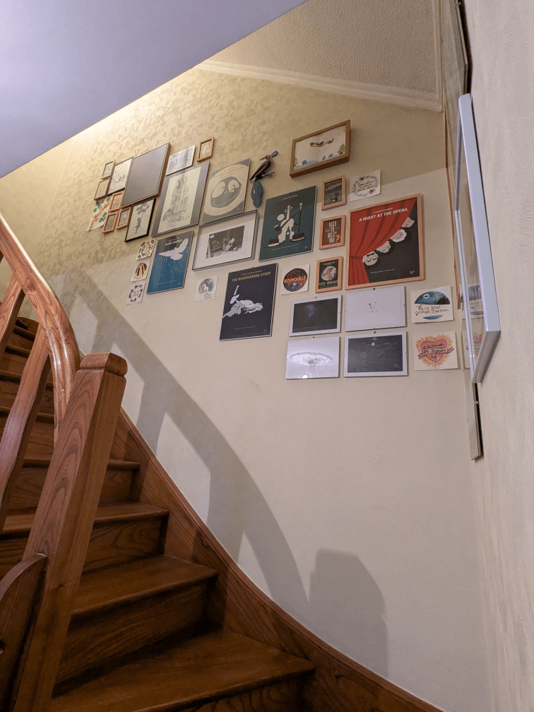 Et on a aussi créé un mur de cadres dans l’escalier qui grimpe à l’étage. J’adore le rendu un peu « mini-musée », il ne manquera plus qu’à repeindre les murs et le plafond, et changer le luminaire qui est toujours d’époque.