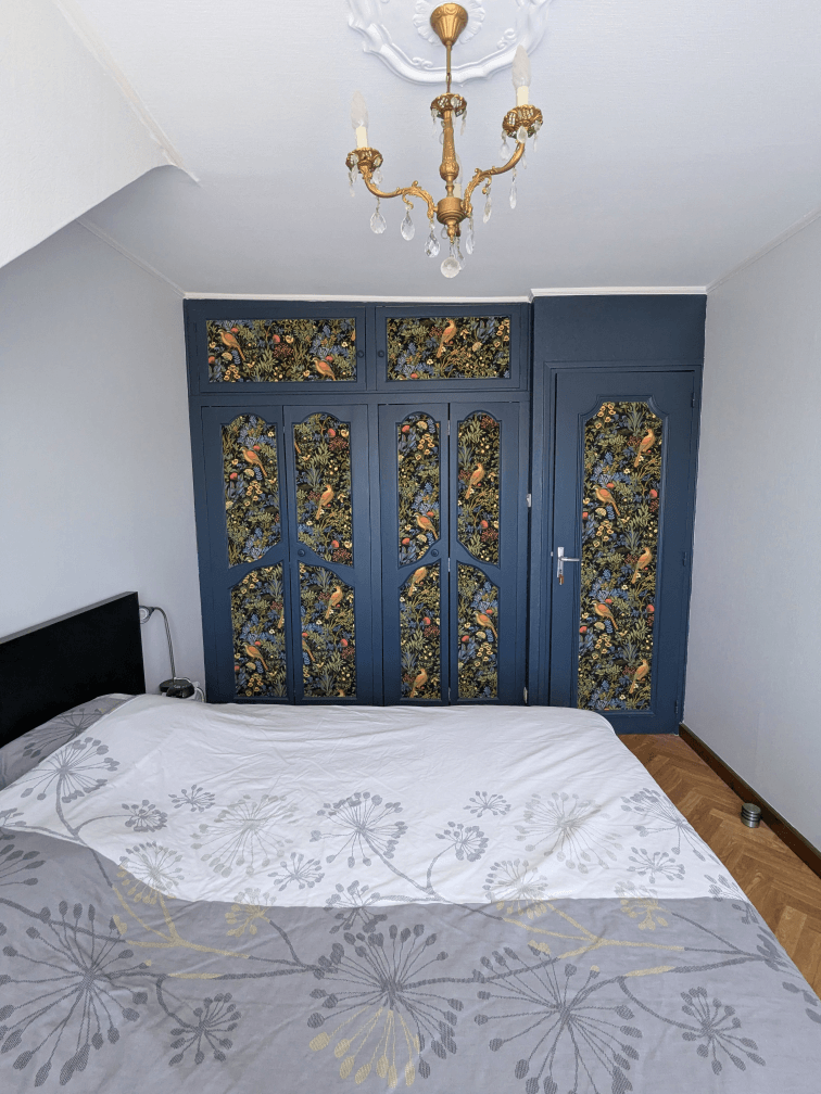 Et enfin, la chambre d’amis, dont je suis plutôt satisfaire du rendu ! J’adore le mur avec le placard et la porte, la tapisserie m’avait tapé dans l’œil en magasin, un an plus tard je l’aime toujours autant…