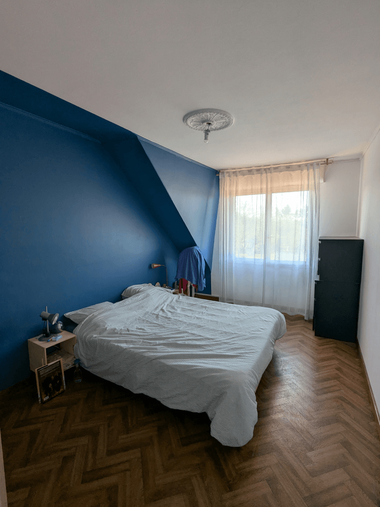 Voilà les avant/après des chambres ! La première, avec le mur bleu vif, c’est la nôtre. Il reste à trouver un luminaire, créer un dressing et j’aimerais refaire les tables de nuit, qui commencent à fatiguer. Et j’ai un projet aussi pour la commode Malm, que je souhaite pimper un peu…