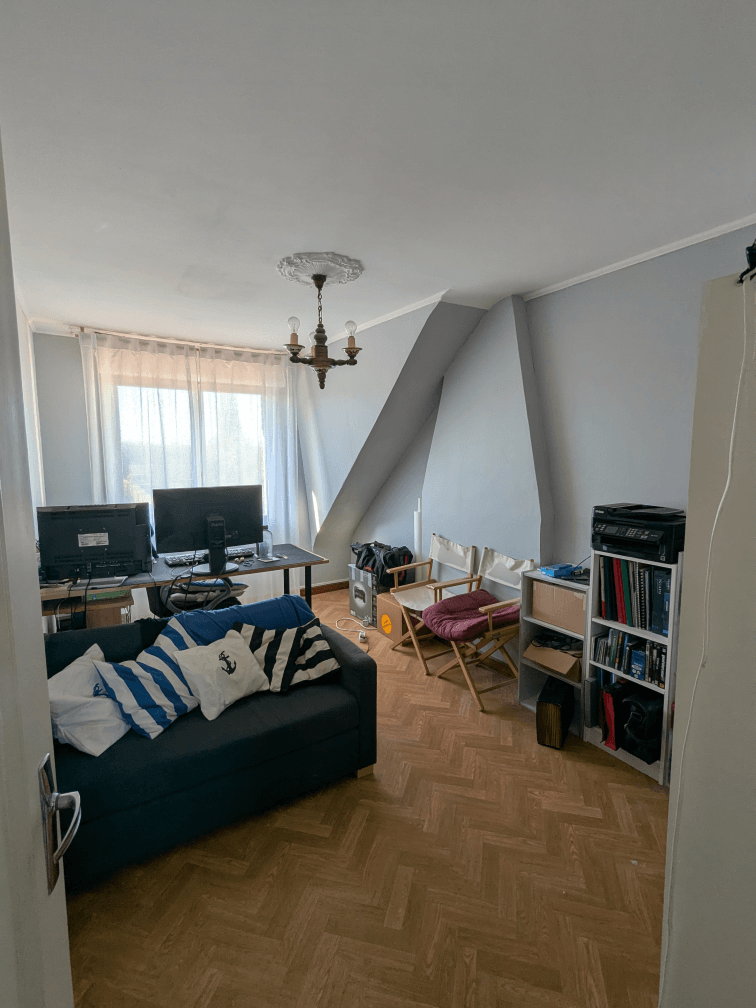 Dans le bureau de mon Lui, c’est ordinateur à gogo. Là il restera à changer le luminaire et mettre des plinthes sur le bout de mur rajouté autour du tuyau du poêle qui passe dans la pièce.