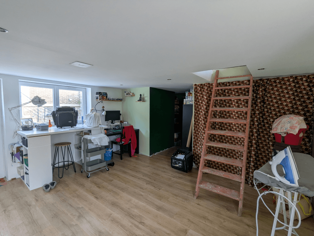 L’atelier a subit une transformation impressionnante lui aussi : électricité refaite à neuf, isolation complète, changement des menuiseries… Tout ça par des artisans. Moi j’ai fait le sol et les peintures, et l’aménagement sur les conseils d’une architecte d’intérieur. Il me reste encore les plinthes à poser et l’aménagement n’est pas définitif, je dois transformer le grand bureau blanc en table de coupe pour la couture.